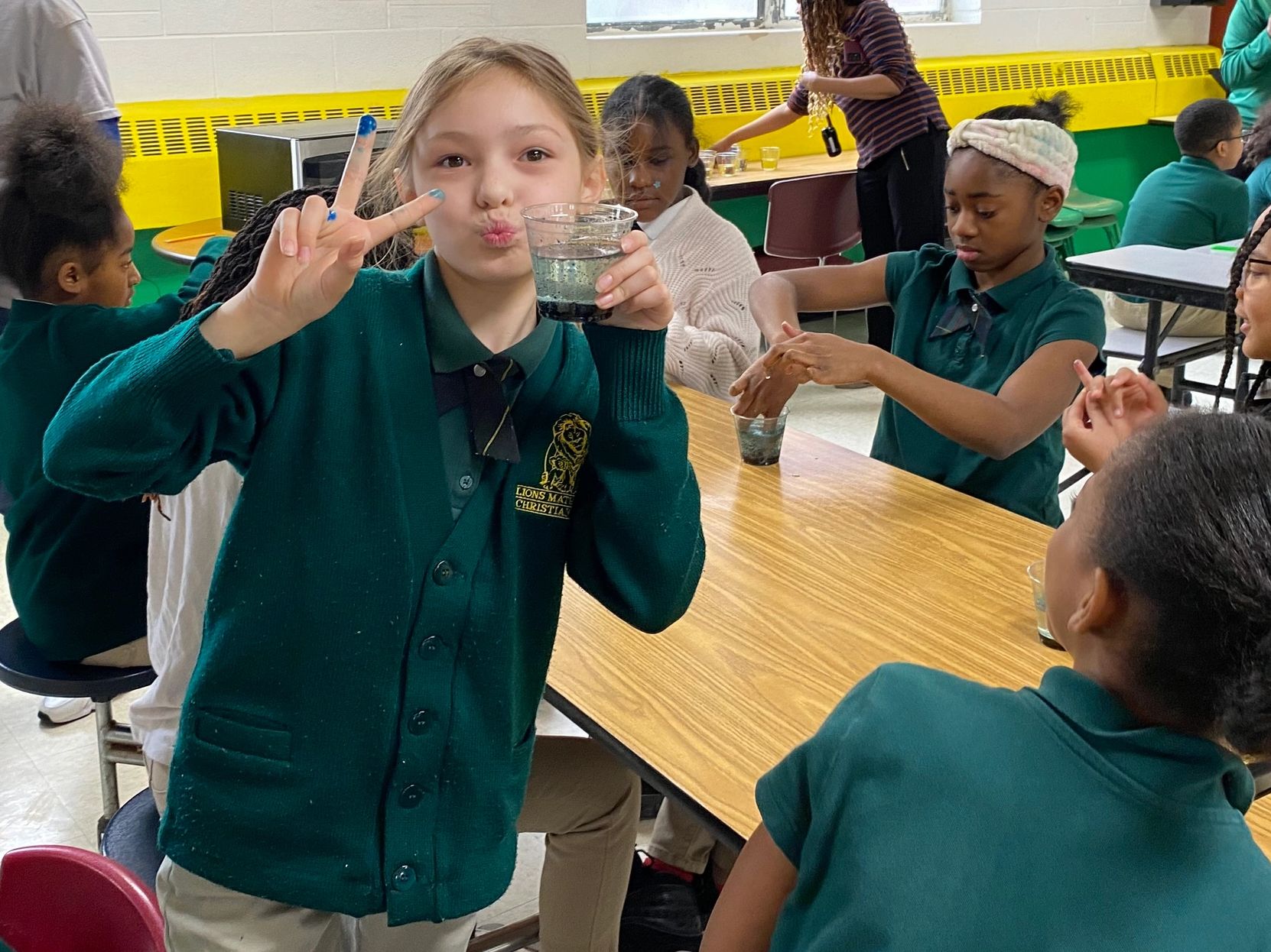 We started this assembly with a brief explanation of how the experiment works with simple household items: water, vegetable oil, food coloring, and Alka-Seltzer tables. Then we gave each student the opportunity to make their own lava lamp, throwing an Alka-Seltzer tablet into their own cup full of water, vegetable oil, and just a few drops of food coloring. Together, we saw as the reaction caused colorful bubbles to fizz and float. We loved seeing the students' faces light up with excitement as they watched the mesmerizing reaction take place.